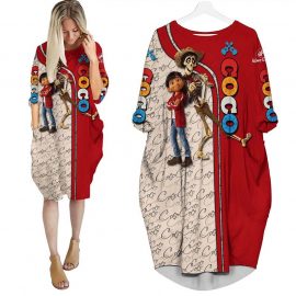 Red Coco Musical Pattern Disney Cartoon Summer Vacation Women Girls Batwing Pocket Dress LP31