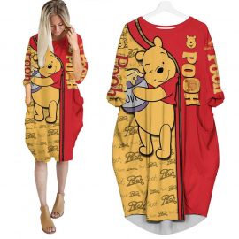 Red Winnie The Pooh Cute Disney Cartoon Summer Vacation Women Girls Batwing Pocket Dress LP46