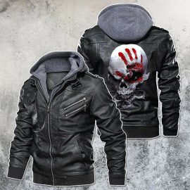 Skull Biker With Blood Hand Print Leather Jacket With Removable Hood
