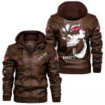 - Two solid colors: black/brown. The black leather jacket features a grey hood and the brown leather jacket features a brown hood.