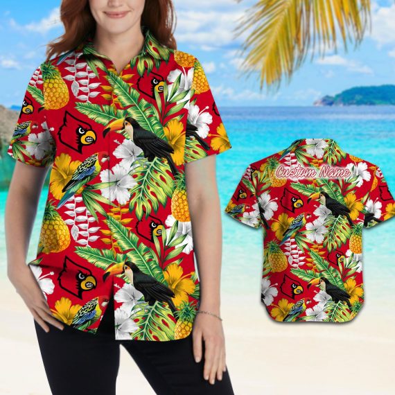 Louisville Cardinals Custom Name Parrot Floral Tropical Short Sleeve Button Up Aloha Hawaiian Shirts NCAA