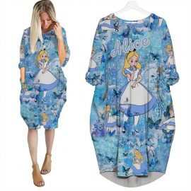 Blue Butterfly Alice In Wonderland Glitter Disney Cartoon Summer Vacation Women Girls Batwing Pocket Dress LP16