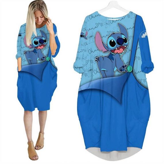 Ohana Stitch Blue Cute Disney Cartoon Summer Vacation Women Girls Batwing Pocket Dress LP12