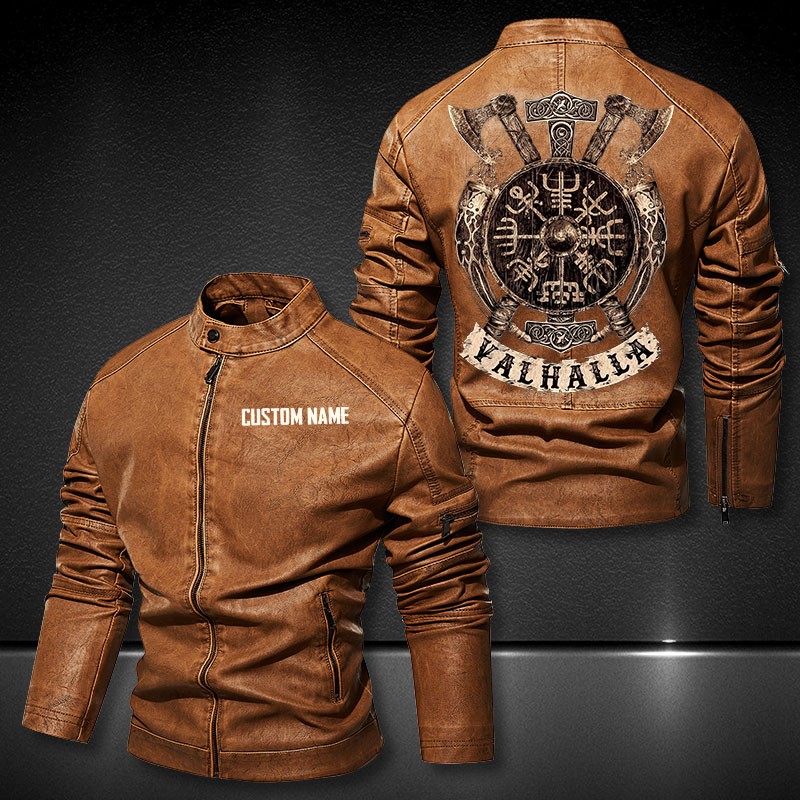 Perseonalized Stand Collar Leather Jacket For Men Viking Vegvisir Shield