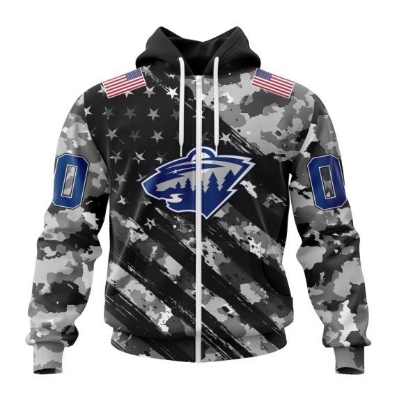 Personalized Minnesota Wild Grey Camo Military Design And USA Flags On Shoulder